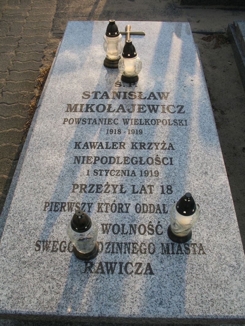Mikołajewicz Stanisław Kawaler Krzyża Niepodległości Mikołajewicz Stanisław (1901-1919) – powstaniec wielkopolski, jeden z najmłodszych działaczy polskiego ruchu niepodległościowego na ziemi rawickiej. Urodził się 20 kwietnia 1901 roku w Rawiczu, w rodzinie rolników Marcina i Michaliny z Popielasów. Rodzice posiadali gospodarstwo rolne przy ulicy Zakątnej (obecnie ul. S. Mikołajewicza). Ukończył miejscową szkołę powszechną. Od 1918 roku Mikołajewicz był związany z tajną polską organizacją niepodległościową, zajmował się m.in. pozyskiwaniem broni dla członków Towarzystwa Gimnastycznego „Sokół”. Jako kurier wyjeżdżał do Berlina. W momencie wybuchu powstania wielkopolskiego, 27 i 28 grudnia 1918 r., uczestniczył w walkach ulicznych w Poznaniu, następnie wrócił do rodzinnego domu w Rawiczu. Niektóre opracowania biograficzne zawierają informację, że został ranny podczas ulicznej strzelaniny na początku stycznia 1919 roku, jeszcze zanim w okolicy Rawicza rozpoczęły się działania powstańcze. W lutym 1919 roku został aresztowany przez Niemców. Z aresztu w Rawiczu przewieziono go do więzienia w Głogowie, następnie do obozu dla internowanych powstańców w Żaganiu. Zmarł w obozie w Żaganiu 19 lutego 1919 roku, w wyniku odniesionych ran, pozbawiony właściwej opieki medycznej. Został uroczyście pochowany na cmentarzu parafialnym w Rawiczu, a jego pogrzeb miał charakter manifestacji patriotycznej. Pośmiertnie odznaczony Krzyżem Niepodległości. Patron jednej z rawickich ulic. Na jego grobie umieszczono pamiątkowy napis: „Pierwszy, który oddał życie za wolność swego rodzinnego miasta Rawicza”. Patron jednej z ulic w Rawiczu. Pierwszy, który oddał życie za wolność swojego rodzinnego miasta |